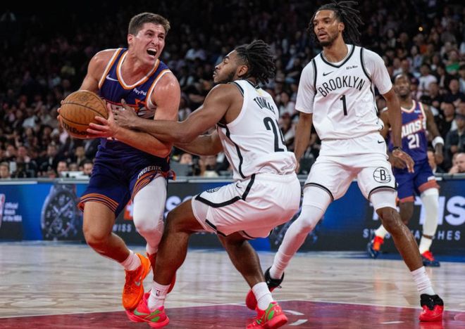易边再战,曼恩强投三分命中后飞身补篮再中,一人连砍5分助队反超比分。19号秀特拉奥雷连续犯错,先是失误丢球,随后又被吹罚进攻犯规,已经出现四次失误,邓恩抢断后快速反击完成双手重扣,布克突破强打曼恩,左手拉杆上篮打进,还有加罚,太阳重新领先到6分。小托马斯突破飞抛助攻克拉克斯顿完成空接暴扣,狄龙争抢前板再次被吹罚犯规,领到个人第6犯被驱逐出场。三节打完,篮网81-88落后太阳7分。