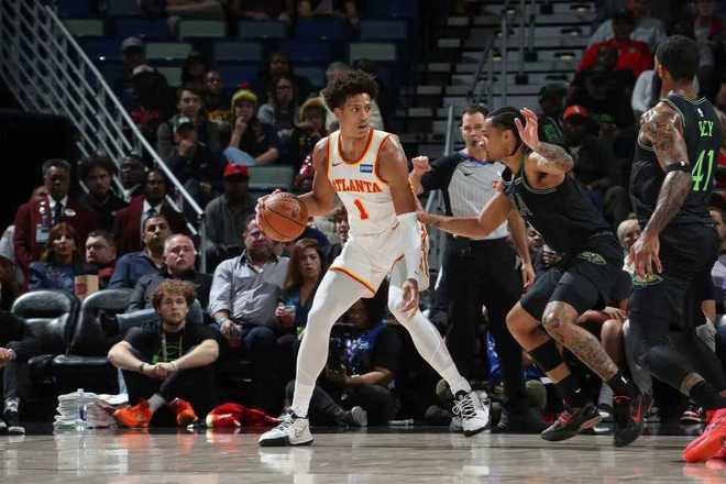 老鹰过去两场连输活塞与马刺遭遇2连败,鹈鹕过去8场遭遇8连败稳居西部倒数第一。本场老鹰缺少特雷-杨、奥孔古与华莱士,鹈鹕缺少锡安、穆雷、普尔与马特科维奇。首节开局老鹰4-10落后,并在之后继续被拉开6-13落后,肯纳德与杰伦各中一记三分追到差1分。鹈鹕连得5分,老鹰连追4分,双方继续缠斗至老鹰21-23落后,米西反篮得分,首节比赛结束老鹰21-25落后鹈鹕。