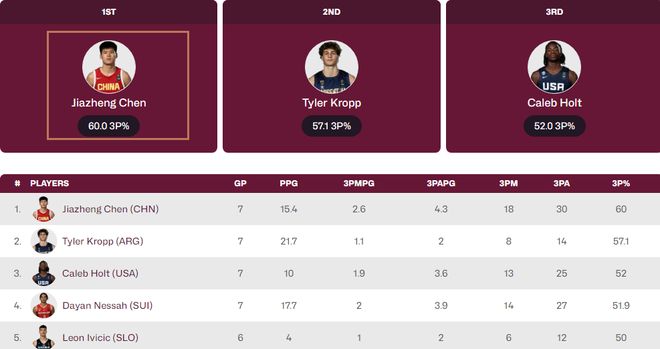 陈家政在U19男篮世界杯上,陈家政场均得到15.4分3.0篮板2.1助攻1.1抢断,投篮命中率60.3%,三分命中率60.0%,罚球命中率87.5%。整届赛事,陈家政三分球总计30投18中。他的三分命中率排名第一,是世青赛的三分王。他在世青赛的表现盖过了球队核心张博源。
