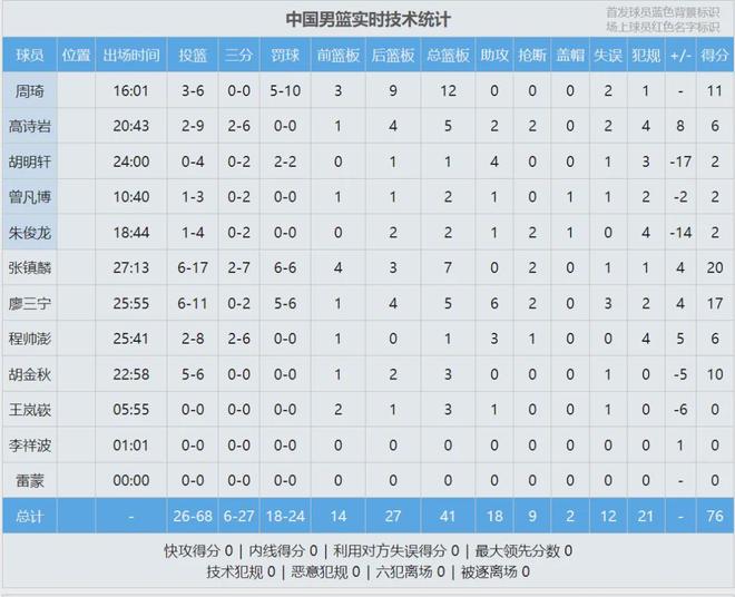 全场结束,中国男篮76比80不敌韩国。张镇麟20分、廖三宁17分;李贤重三分14中9,狂砍33分10板。最后看看数据,说说你的心情: