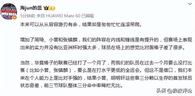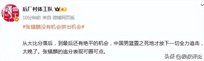 博主“后厂村体工队”发文点评:从大比分落后,到最后还有绝平的机会,中国男篮置之死地才放下一切全力追击,太晚了。张镇麟的追分表现可圈可点。