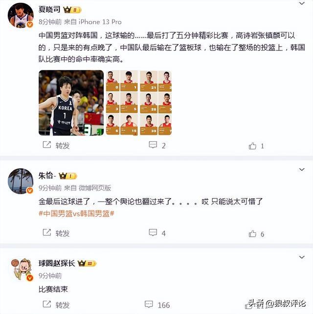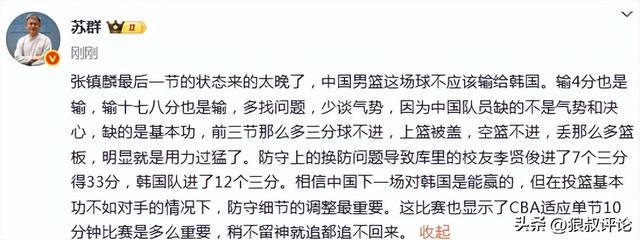 媒体人苏群发文点评:张镇麟最后一节的状态来的太晚了,中国男篮这场球不应该输给韩国。输4分也是输,输十七八分也是输,多找问题,少谈气势,因为中国队员缺的不是气势和决心,缺的是基本功,前三节那么多三分球不进,上篮被盖,空篮不进,丢那么多篮板,明显就是用力过猛了。防守上的换防问题导致库里的校友李贤俊进了7个三分得33分,韩国队进了12个三分。相信中国下一场对韩国是能赢的,但在投篮基本功不如对手的情况下,防守细节的调整最重要。这比赛也显示了CBA适应单节10分钟比赛是多么重要,稍不留神就追都追不回来。