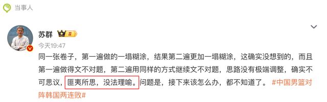 苏群说:“同一张卷子,第一遍做的一塌糊涂,结果第二遍更加一塌糊涂,这确实没想到的,而且第一遍做得文不对题,第二遍用同样的方式继续文不对题,思路没有极端调整,确实不可思议,匪夷所思,没法理喻。问题是,接下来该怎么办,都不知道了。”