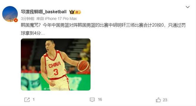 连续两场比赛都输给了韩国,这是一场值得高度总结的比赛。值得一提的是,本场比赛胡明轩8中0仅靠罚球拿到2分,而近三场面对韩国队,两场是世界杯,亚洲预选赛加一场亚洲杯,胡明轩合计19中0,仅靠罚球得到4分。
