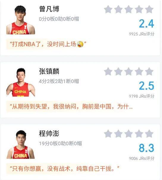 比赛结束后,有超过11.2万的球迷对球员的表现进行了评分,中国男篮球员的评分普遍都比较低,只有四名球员的评分还说得过去。这四名球员分别是程帅澎的8.4分、周琦的7分、廖三宁的7.7分,以及胡金秋的6.1分。至于其他球员和中国男篮主教练郭士强的评分,有些惨不忍睹。