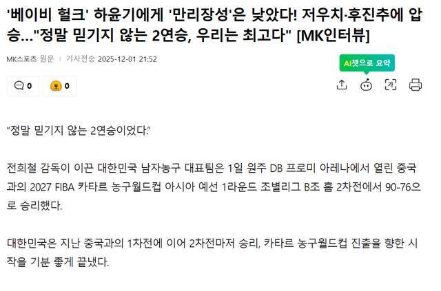 在韩国男篮世预赛双杀中国男篮之后,韩国媒体也变得活跃起来,他们的言辞越来越不礼貌,越来越有攻击性。有一篇报道《夏润基完胜周琦胡金秋,万里长城黯然失色》,暗讽中国队所谓的亚洲顶级内线是纸老虎。