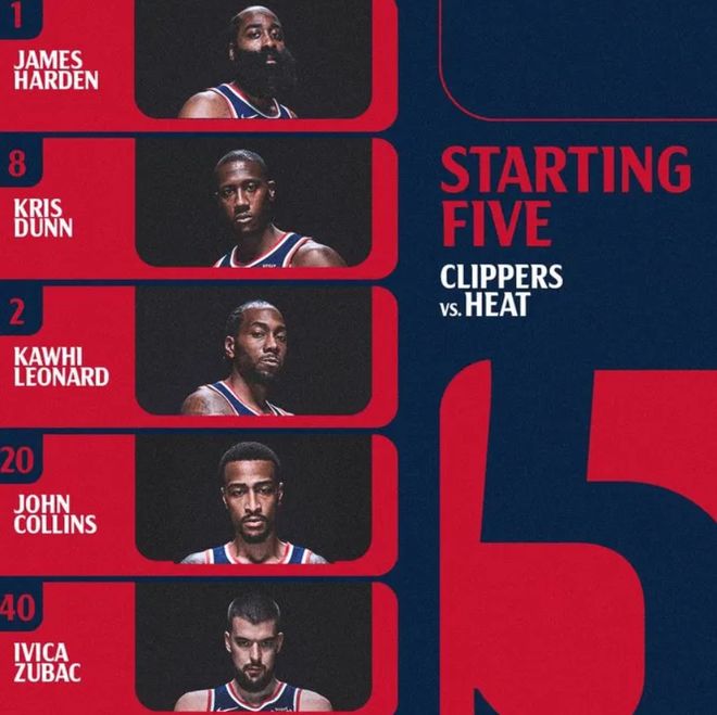 首发阵容方面,快船队这边,博格丹诺维奇和乔丹-米勒缺战,伦纳德可以出战,泰伦卢排出的最新首发五人组为:哈登、邓恩、伦纳德、科林斯、祖巴茨;热火队这边,首发阵容则为:小米切尔、希罗、鲍威尔、威金斯、阿德巴约。
