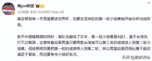 媒体人“海jun的蓝”发文点评说道:“真没想到有一天男篮要进世界杯,也要在亚洲区的第一轮小组赛就开始分析出线形势。