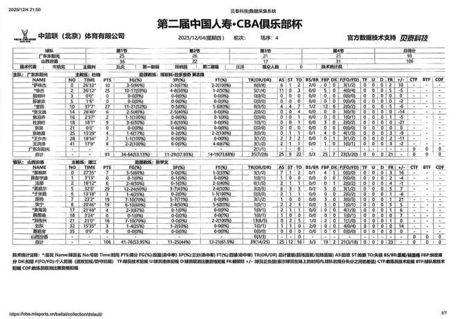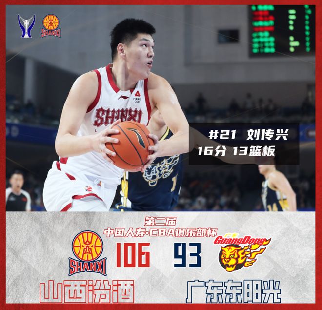 北京时间2025年12月4日20:00,第二届中国人寿·CBA俱乐部杯赛第二轮继续进行,山西汾酒对阵广东东阳光。本场比赛,山西队开局发挥出色,进攻端多点开花迅速建立领先优势,比赛过程中仍旧暴露出很多问题,好在最后拼搏到底锁定胜局,球队阵容仍需继续磨合,更进一步!最终全场比赛结束,山西汾酒106:93战胜广东东阳光,拿下两连胜,锁定D组上半区第1名。