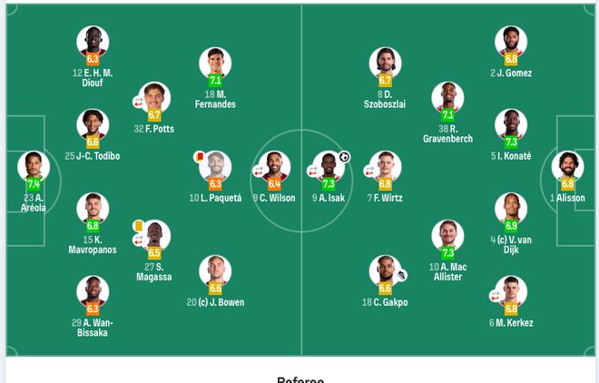利物浦首发:1-阿利松、2-戈麦斯、4-范戴克、5-科纳特、6-凯尔凯兹(86’26-罗伯逊)、8-索博斯洛伊、10-麦卡利斯特、38-赫拉芬贝赫、7-维尔茨(75’17-琼斯)、18-加克波、9-伊萨克(67’22-埃基蒂克)。