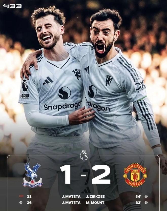 易边再战,B费上演助攻梅开二度,齐尔克泽、芒特分别破门,最终曼联在客场实现逆转。赢球之后的曼联终结了各项赛事3场不胜。