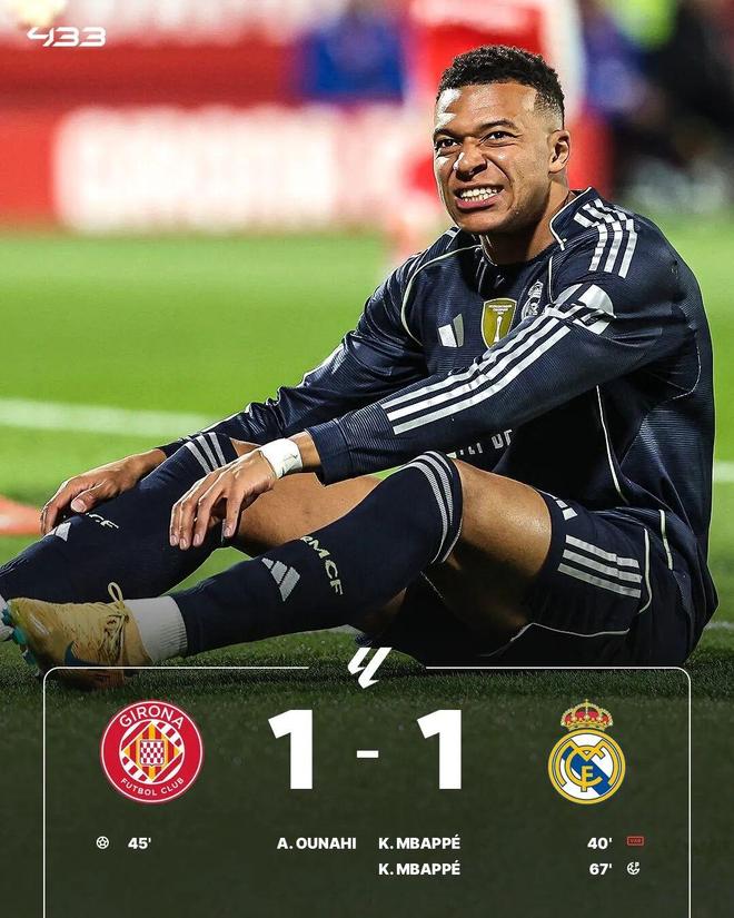 皇马客场1-1战平赫罗纳,此役,银河战舰仅仅依靠姆巴佩打进一记点球,才避免在客场失利。