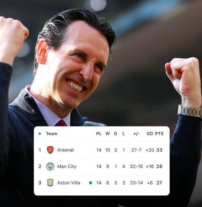凭借着近期神勇的表现,埃梅里的球队目前在英超积分榜上已经上升至第三位,力压切尔西、利物浦、纽卡、曼联等一众强敌。